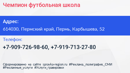 Чемпион, футбольная школа по адресу 614030, Пермский край, Пермь, Карбышева, 52 в дальнейшем Организация, размещена в следующих категориях: