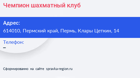 Чемпион, шахматный клуб по адресу 614010, Пермский край, Пермь, Клары Цеткин, 14 в дальнейшем Организация, размещена в следующих категориях: