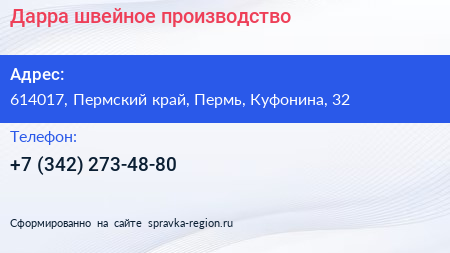Дарра, швейное производство по адресу 614017, Пермский край, Пермь, Куфонина, 32 в дальнейшем Организация, размещена в следующих категориях: