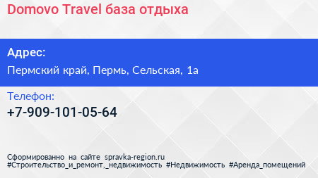Domovo Travel, база отдыха по адресу Пермский край, Пермь, Сельская, 1а в дальнейшем Организация, размещена в следующих категориях: