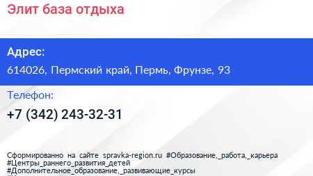 Элит, база отдыха по адресу 614026, Пермский край, Пермь, Фрунзе, 93 в дальнейшем Организация, размещена в следующих категориях: