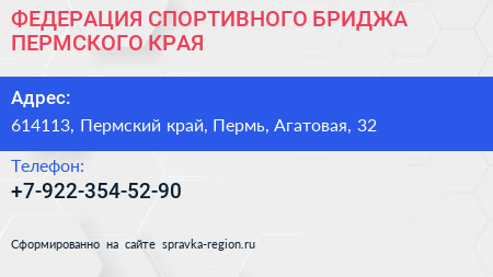 ФЕДЕРАЦИЯ СПОРТИВНОГО БРИДЖА ПЕРМСКОГО КРАЯ по адресу 614113, Пермский край, Пермь, Агатовая, 32 в дальнейшем Организация, размещена в следующих категориях: