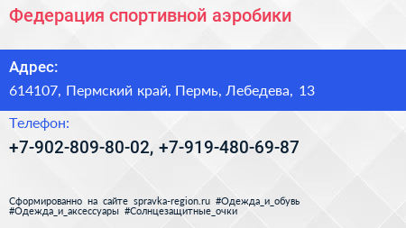 Федерация спортивной аэробики по адресу 614107, Пермский край, Пермь, Лебедева, 13 в дальнейшем Организация, размещена в следующих категориях: