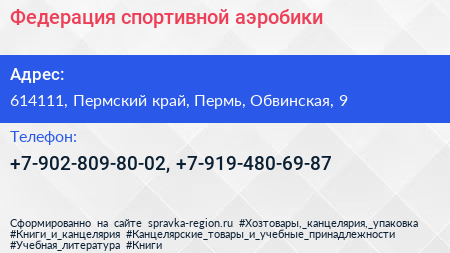Федерация спортивной аэробики по адресу 614111, Пермский край, Пермь, Обвинская, 9 в дальнейшем Организация, размещена в следующих категориях: