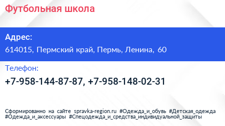 Футбольная школа по адресу 614015, Пермский край, Пермь, Ленина, 60 в дальнейшем Организация, размещена в следующих категориях: