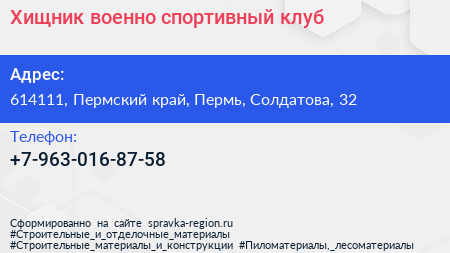 Хищник, военно-спортивный клуб по адресу 614111, Пермский край, Пермь, Солдатова, 32 в дальнейшем Организация, размещена в следующих категориях: