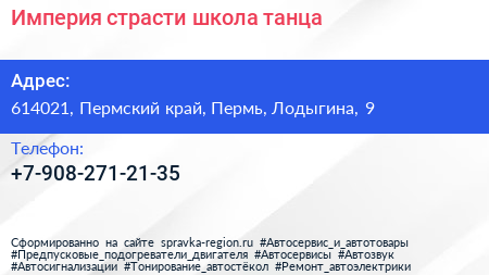 Империя страсти, школа танца по адресу 614021, Пермский край, Пермь, Лодыгина, 9 в дальнейшем Организация, размещена в следующих категориях: