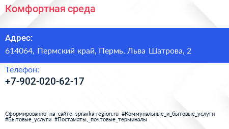 Комфортная среда по адресу 614064, Пермский край, Пермь, Льва Шатрова, 2 в дальнейшем Организация, размещена в следующих категориях:
