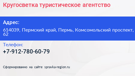 Кругосветка, туристическое агентство по адресу 614039, Пермский край, Пермь, Комсомольский проспект, 62 в дальнейшем Организация, размещена в следующих категориях: