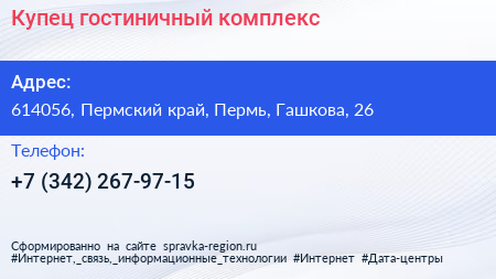 Купец, гостиничный комплекс по адресу 614056, Пермский край, Пермь, Гашкова, 26 в дальнейшем Организация, размещена в следующих категориях: