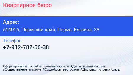 Квартирное бюро по адресу 614016, Пермский край, Пермь, Елькина, 39 в дальнейшем Организация, размещена в следующих категориях: