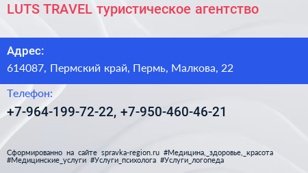 LUTS TRAVEL, туристическое агентство по адресу 614087, Пермский край, Пермь, Малкова, 22 в дальнейшем Организация, размещена в следующих категориях: