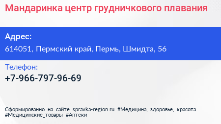 Мандаринка, центр грудничкового плавания по адресу 614051, Пермский край, Пермь, Шмидта, 56 в дальнейшем Организация, размещена в следующих категориях: