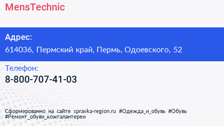 MensTechnic по адресу 614036, Пермский край, Пермь, Одоевского, 52 в дальнейшем Организация, размещена в следующих категориях: