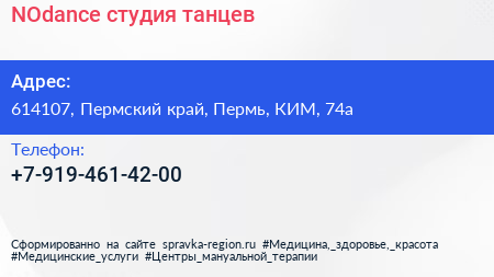 NOdance, студия танцев по адресу 614107, Пермский край, Пермь, КИМ, 74а в дальнейшем Организация, размещена в следующих категориях: