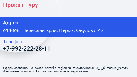 Прокат Гуру по адресу 614068, Пермский край, Пермь, Окулова, 47 в дальнейшем Организация, размещена в следующих категориях: