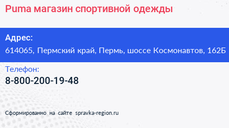 Puma, магазин спортивной одежды по адресу 614065, Пермский край, Пермь, шоссе Космонавтов, 162Б в дальнейшем Организация, размещена в следующих категориях: