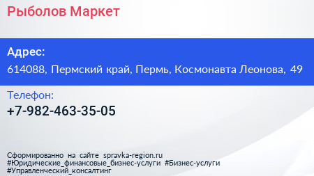 Рыболов Маркет по адресу 614088, Пермский край, Пермь, Космонавта Леонова, 49 в дальнейшем Организация, размещена в следующих категориях: