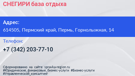 СНЕГИРИ, база отдыха по адресу 614505, Пермский край, Пермь, Горнолыжная, 14 в дальнейшем Организация, размещена в следующих категориях: