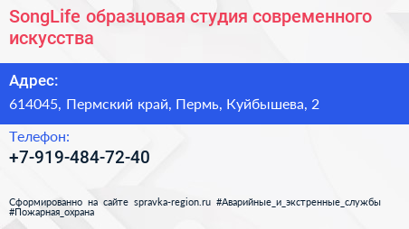 SongLife, образцовая студия современного искусства по адресу 614045, Пермский край, Пермь, Куйбышева, 2 в дальнейшем Организация, размещена в следующих категориях: