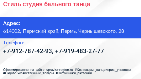 Стиль, студия бального танца по адресу 614002, Пермский край, Пермь, Чернышевского, 28 в дальнейшем Организация, размещена в следующих категориях: