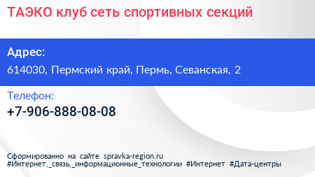 ТАЭКО-клуб, сеть спортивных секций по адресу 614030, Пермский край, Пермь, Севанская, 2 в дальнейшем Организация, размещена в следующих категориях: