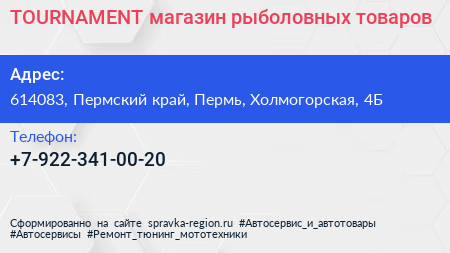 TOURNAMENT, магазин рыболовных товаров по адресу 614083, Пермский край, Пермь, Холмогорская, 4Б в дальнейшем Организация, размещена в следующих категориях: