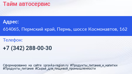 Тайм, автосервис по адресу 614065, Пермский край, Пермь, шоссе Космонавтов, 162 в дальнейшем Организация, размещена в следующих категориях: