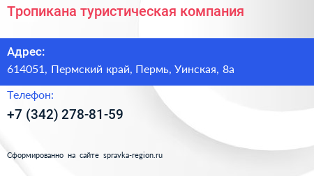 Тропикана, туристическая компания по адресу 614051, Пермский край, Пермь, Уинская, 8а в дальнейшем Организация, размещена в следующих категориях:
