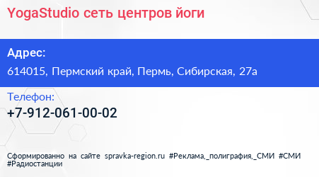 YogaStudio, сеть центров йоги по адресу 614015, Пермский край, Пермь, Сибирская, 27а в дальнейшем Организация, размещена в следующих категориях: