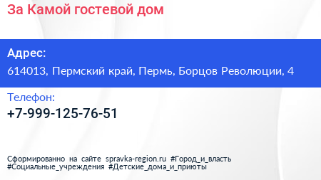 За Камой, гостевой дом по адресу 614013, Пермский край, Пермь, Борцов Революции, 4 в дальнейшем Организация, размещена в следующих категориях: