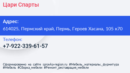 Цари Спарты по адресу 614025, Пермский край, Пермь, Героев Хасана, 105 к70 в дальнейшем Организация, размещена в следующих категориях: