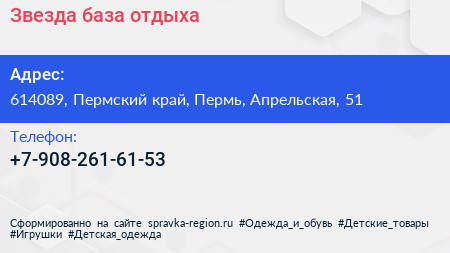 Звезда, база отдыха по адресу 614089, Пермский край, Пермь, Апрельская, 51 в дальнейшем Организация, размещена в следующих категориях: