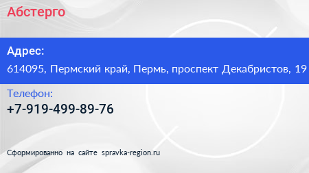 Абстерго по адресу 614095, Пермский край, Пермь, проспект Декабристов, 19 в дальнейшем Организация, размещена в следующих категориях: