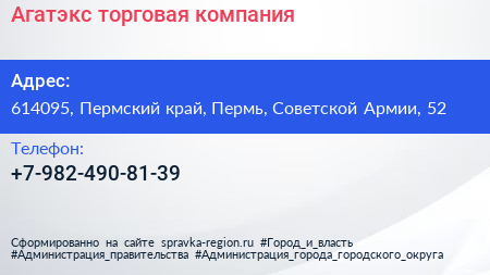 Агатэкс, торговая компания по адресу 614095, Пермский край, Пермь, Советской Армии, 52 в дальнейшем Организация, размещена в следующих категориях: