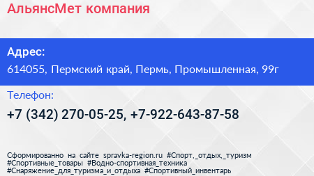 АльянсМет, компания по адресу 614055, Пермский край, Пермь, Промышленная, 99г в дальнейшем Организация, размещена в следующих категориях: