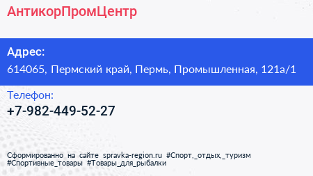 АнтикорПромЦентр по адресу 614065, Пермский край, Пермь, Промышленная, 121а/1 в дальнейшем Организация, размещена в следующих категориях: