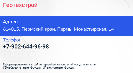 Геотехстрой по адресу 614015, Пермский край, Пермь, Монастырская, 14 в дальнейшем Организация, размещена в следующих категориях:
