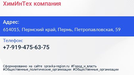ХимИнТех, компания по адресу 614015, Пермский край, Пермь, Петропавловская, 59 в дальнейшем Организация, размещена в следующих категориях: