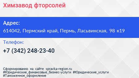 Химзавод фторсолей по адресу 614042, Пермский край, Пермь, Ласьвинская, 98 к19 в дальнейшем Организация, размещена в следующих категориях: