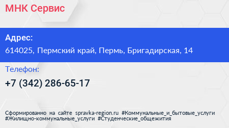 МНК-Сервис по адресу 614025, Пермский край, Пермь, Бригадирская, 14 в дальнейшем Организация, размещена в следующих категориях: