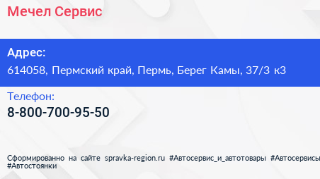 Мечел-Сервис по адресу 614058, Пермский край, Пермь, Берег Камы, 37/3 к3 в дальнейшем Организация, размещена в следующих категориях: