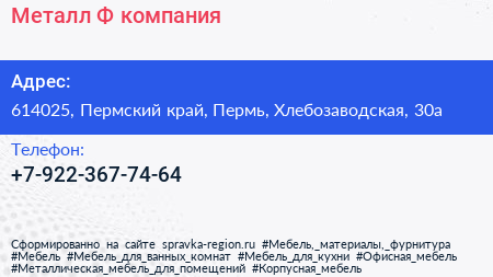 Металл-Ф, компания по адресу 614025, Пермский край, Пермь, Хлебозаводская, 30а в дальнейшем Организация, размещена в следующих категориях: