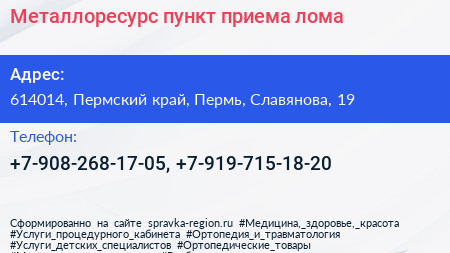 Металлоресурс, пункт приема лома по адресу 614014, Пермский край, Пермь, Славянова, 19 в дальнейшем Организация, размещена в следующих категориях: