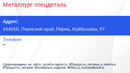 Металлург спецдеталь по адресу 614010, Пермский край, Пермь, Куйбышева, 97 в дальнейшем Организация, размещена в следующих категориях: