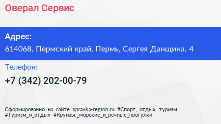 Оверал Сервис по адресу 614068, Пермский край, Пермь, Сергея Данщина, 4 в дальнейшем Организация, размещена в следующих категориях: