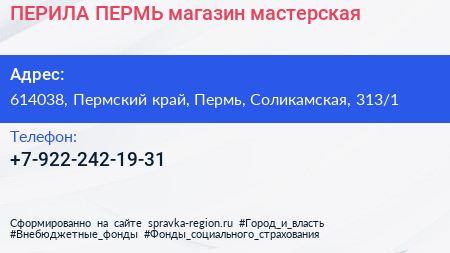 ПЕРИЛА-ПЕРМЬ, магазин-мастерская по адресу 614038, Пермский край, Пермь, Соликамская, 313/1 в дальнейшем Организация, размещена в следующих категориях: