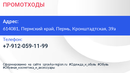 ПРОМОТХОДЫ по адресу 614081, Пермский край, Пермь, Кронштадтская, 39а в дальнейшем Организация, размещена в следующих категориях: