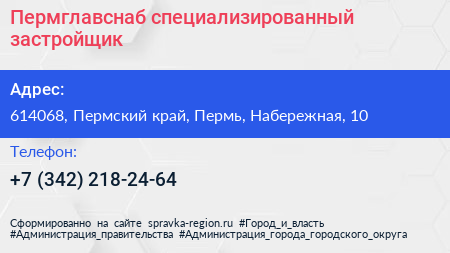 Пермглавснаб, специализированный застройщик по адресу 614068, Пермский край, Пермь, Набережная, 10 в дальнейшем Организация, размещена в следующих категориях: