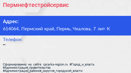 Пермнефтестройсервис по адресу 614064, Пермский край, Пермь, Чкалова, 7 лит К в дальнейшем Организация, размещена в следующих категориях: